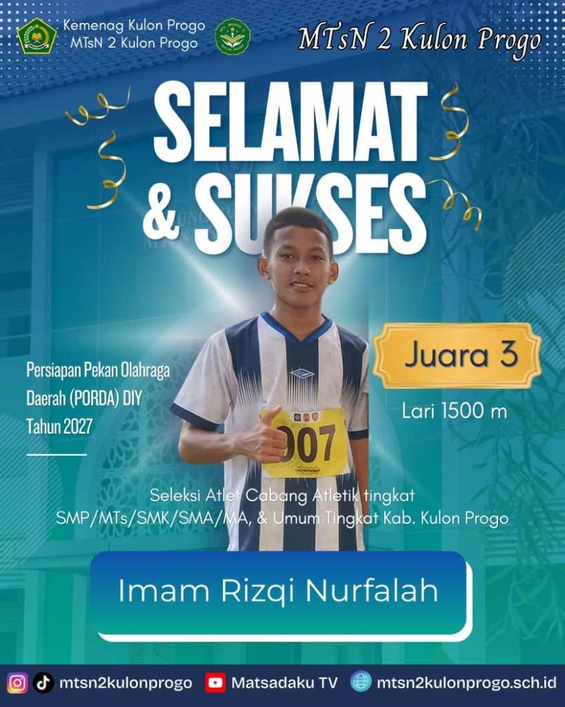 KULON PROGO(MTsN2KP). Prestasi membanaggakan ditorehkan kembali oleh siswa MTsN 2 Kulon Progo dalam ajang olahraga atletik pada nomor lari 1500 m putra tingkat Kabupaten Kulon Progo, yang meraih Juara 3, di Stadion Cangkring, Rabu(4/2/2026)